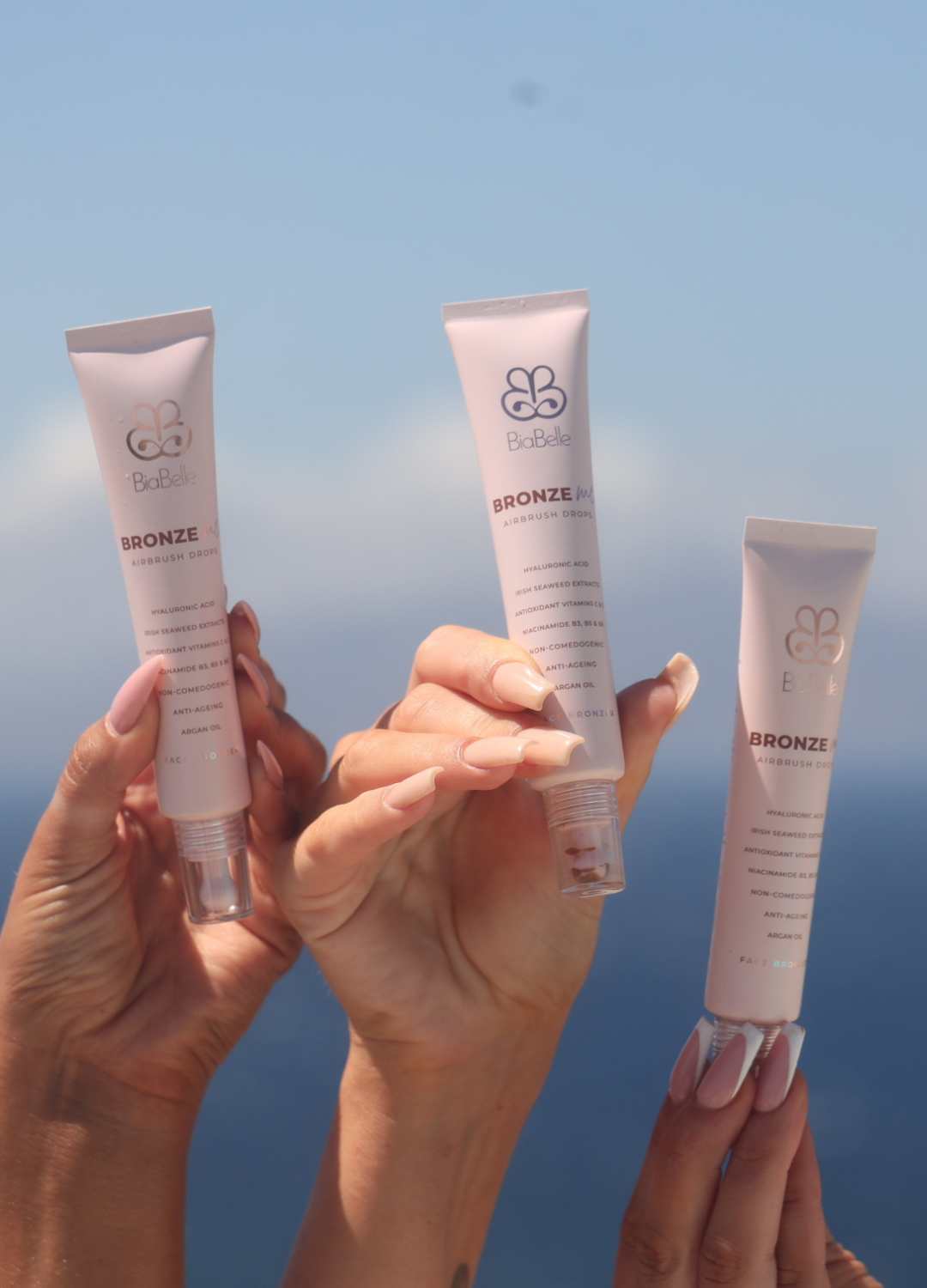 Transform your complexion with BiaBelle's Bronze Me Airbrush Drops! Our revolutionary, skin-tanning elixir blends Argan Oil, Niacinimide, Vitamins, and our signature seaweed extracts and Hyaluronic Acid – for a naturally radiant, anti-aging glow. Use on its own or blend with your favourite skin care, SPF or foundation to leave your face glowing, hydrated and beautiful!